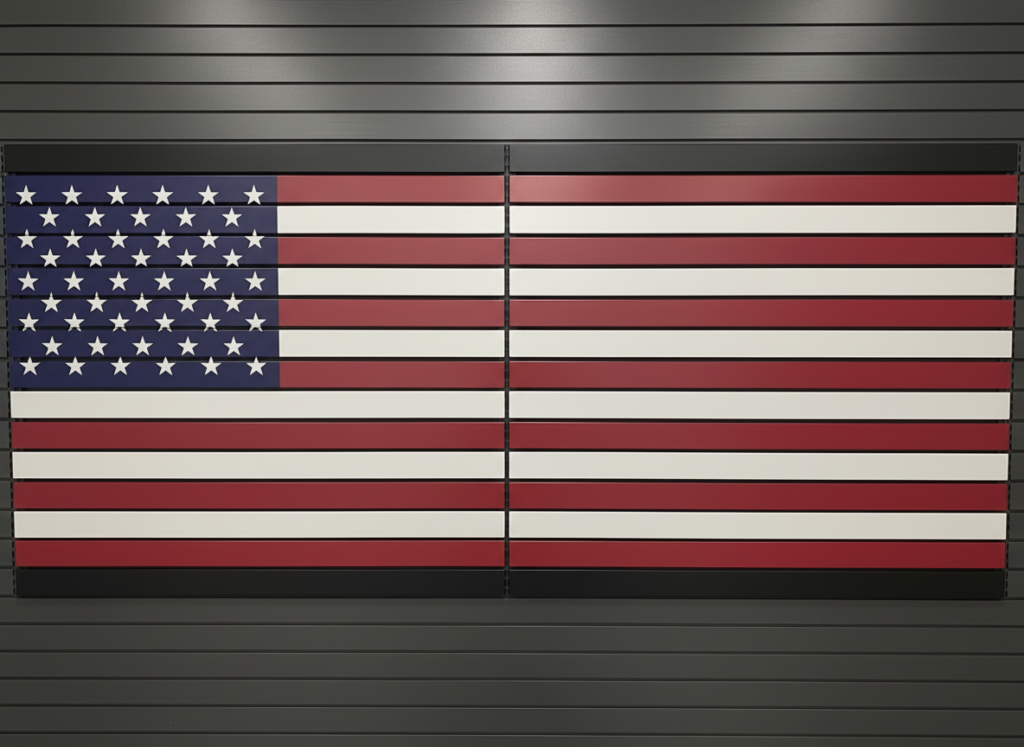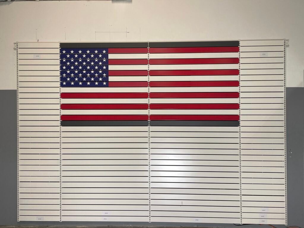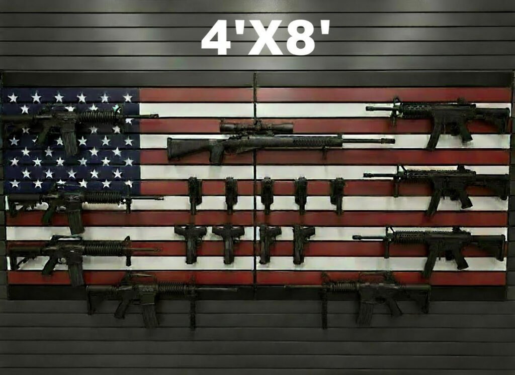 This signature display merges American pride with industrial craftsmanship. Each metal slat panel forms a seamless American flag, engineered for strength, modularity, and premium firearm presentation. Ideal for gun stores, vault rooms, tactical spaces, and professional displays.